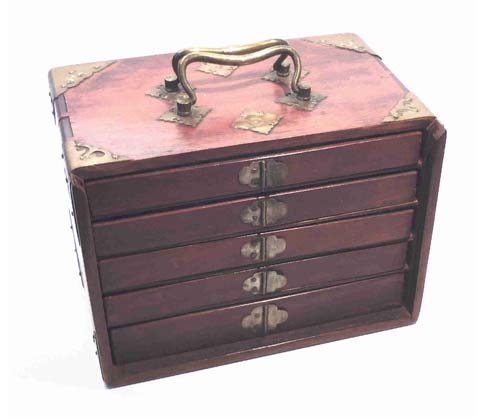 Box (246x177x165mm) is Chinese. Made of quality rosewood. Traditional model with 5 drawers, copper ornaments and a sliding front panel. Three drawers still have their original paper bottom cover.