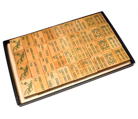 Tiles (22x30x12mm) are made of plain, lacquered, monochrome printed wood. They are typical for Piroxloid. Like the bird on Bamboo 1, the letters on the Dragons and the flower tiles. There belong no spare tiles to the set.