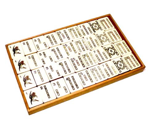 Stenen (22x39x13mm) zijn Duits. Van blank hout beplakt met een laagje kunststof. De karakters, afbeeldingen etc. zijn karakteristiek voor Golconda. Er zijn vier reservestenen.